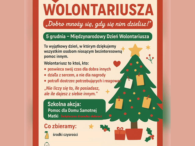 Serdecznie zachęcamy do udziału w akcji charytatywnej "Choinka Dobroci" na rzecz Domu Samotnej Matki w Rzeszowie. Konkretne artykuły są wskazane na serduszkach zdobiących choinkę znajdującą się w holu szkoły. Zabierz jedno z nich ze sobą i przynieś zakupiony artykuł do portierni szkoły. Akcja trwa od 5 do 17 grudnia 2025roku