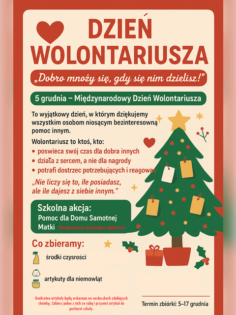Serdecznie zachęcamy do udziału w akcji charytatywnej "Choinka Dobroci" na rzecz Domu Samotnej Matki w Rzeszowie. Konkretne artykuły są wskazane na serduszkach zdobiących choinkę znajdującą się w holu szkoły. Zabierz jedno z nich ze sobą i przynieś zakupiony artykuł do portierni szkoły. Akcja trwa od 5 do 17 grudnia 2025roku