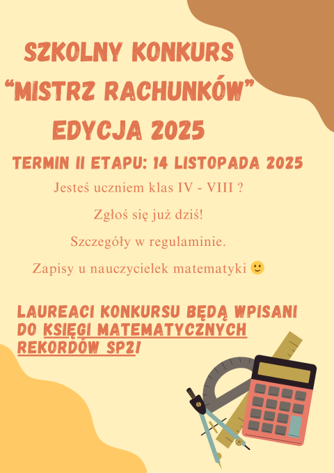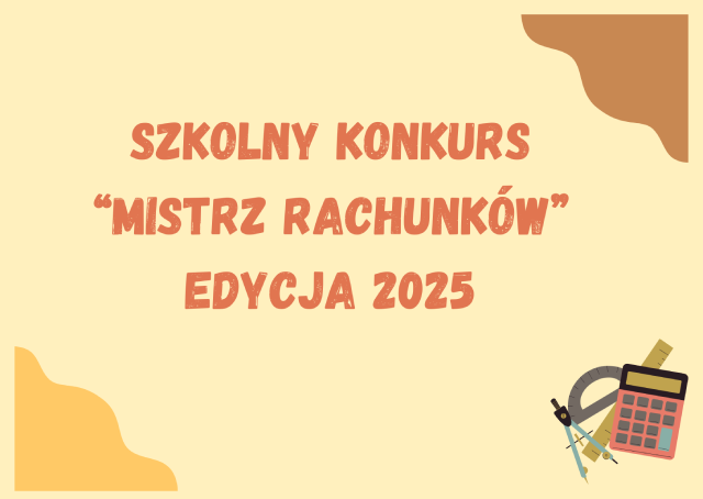 Informujemy, że ruszają zapisy do szkolnego konkursu “Mistrz Rachunków – edycja 2025”. Zachęcamy chętnych uczniów klas IV – VIII do wzięcia w nim udziału.