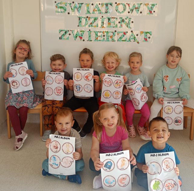 Dzisiaj obchodziliśmy Światowy Dzień Zwierząt, który przypada 4 października. Dzieci rozmawiały o tym, jak należy troszczyć się o zwierzęta oraz opowiadały o swoich pupilach. Następnie przedszkolaki wykonały album przedstawiający różne zwierzęta.